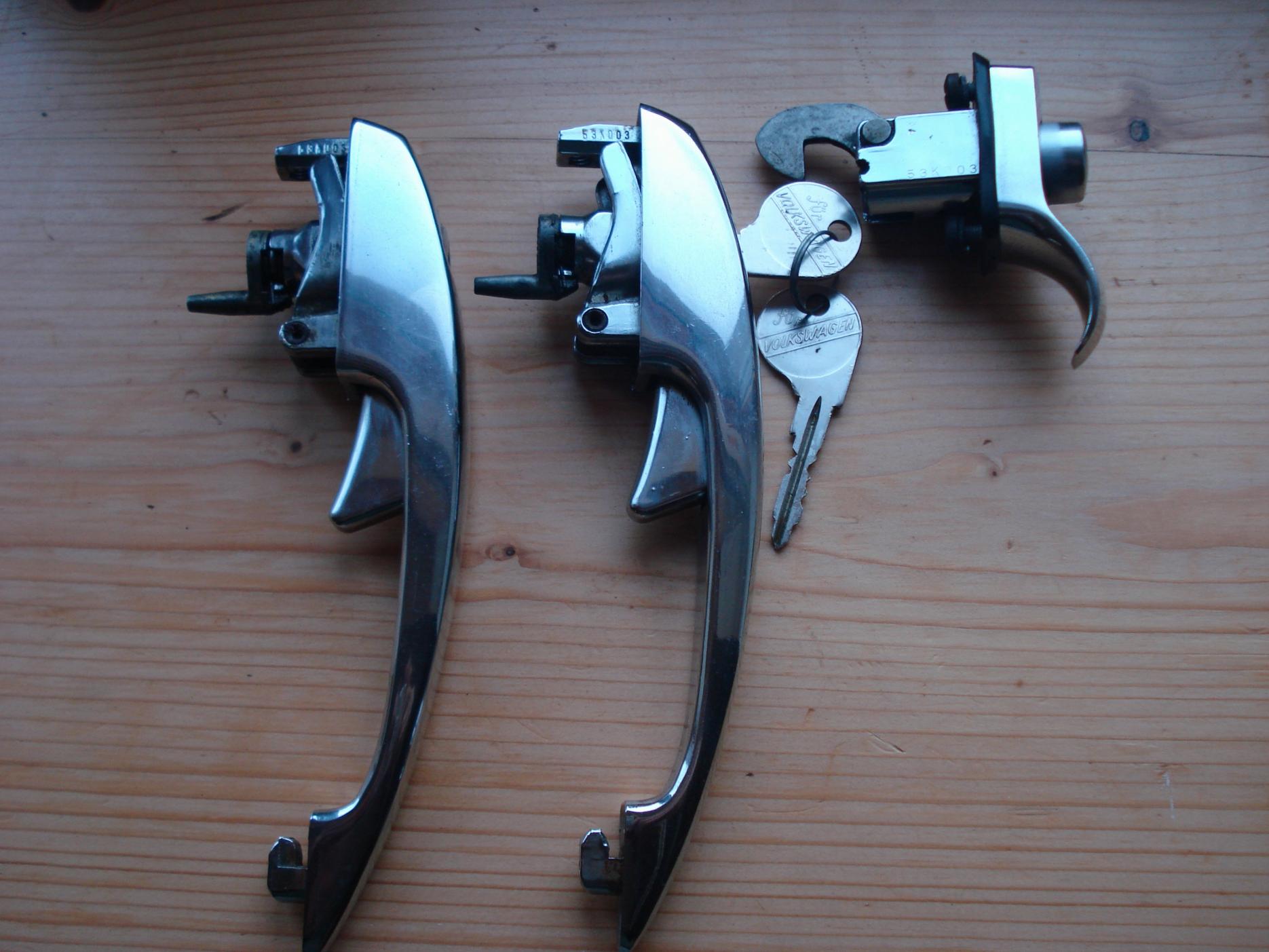 Good used original pair 1968 - '72 door handles (short trigger) & locking engine lid button, all same original VW key code